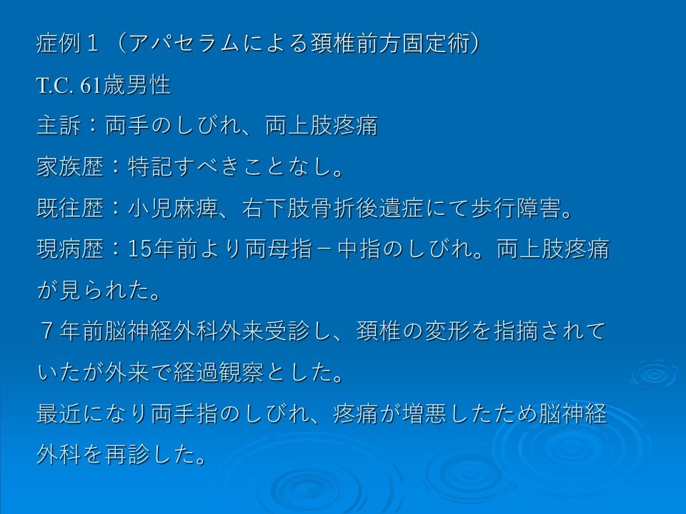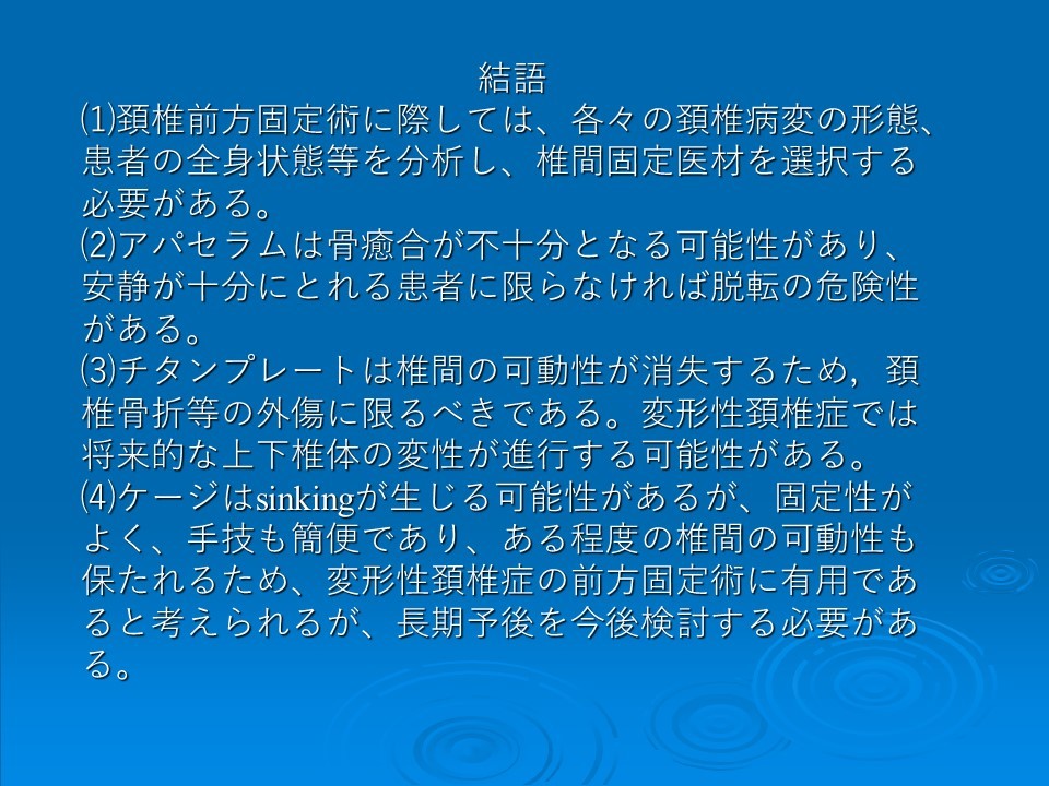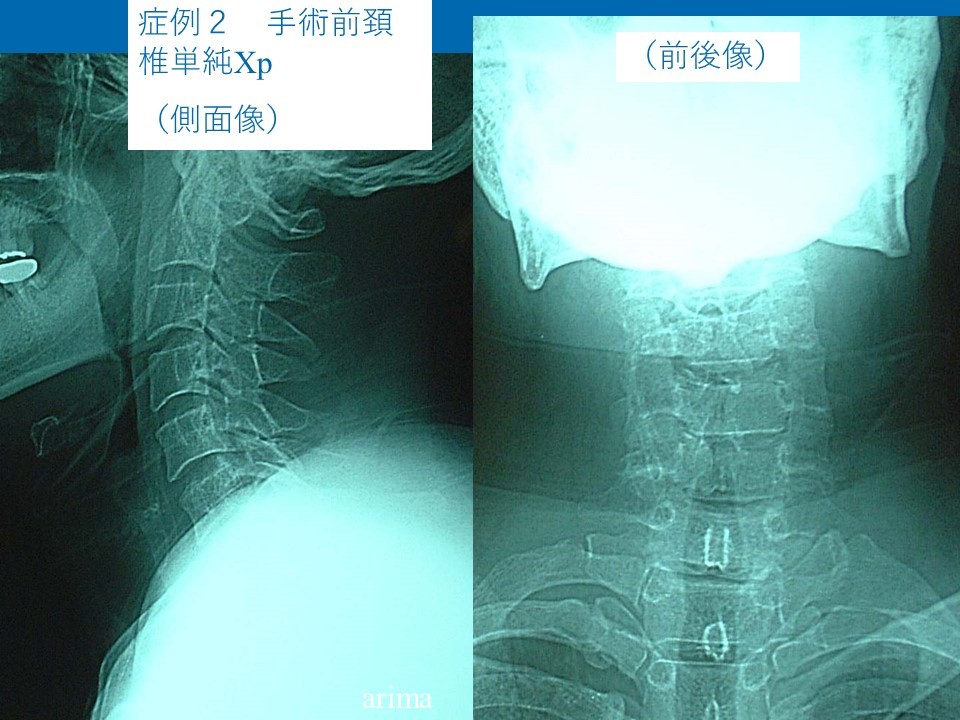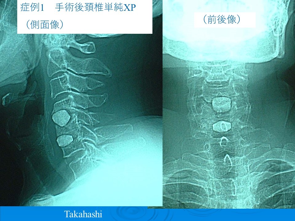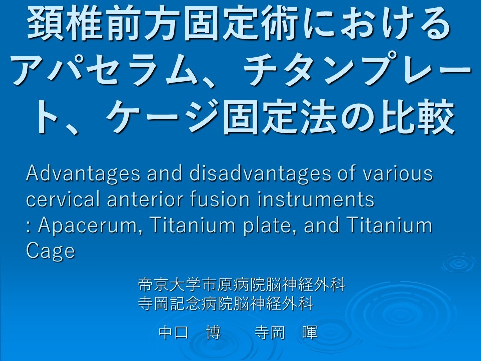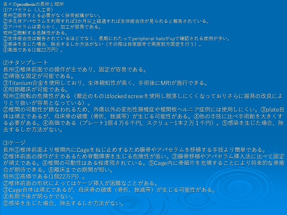 頸椎症に対する手術法は大きく分けて前方よりのアプローチと後方からの椎弓形成術に分けられます。前方アプローチは頚椎症の病態を考えると後方アプローチより理にかなった術式であり、自然な前彎をたもつことができます。顕微鏡下で椎間板を摘出し、椎間板面の椎体をドリルで薄く削開し、さらに後方骨棘をドリルで削除し、自家骨(腸骨という腰の前外側の骨をとります)もしくは人工骨(アパセラム、チタンケージ、プラスチックケージ等)を使用して椎体間固定を行います。
