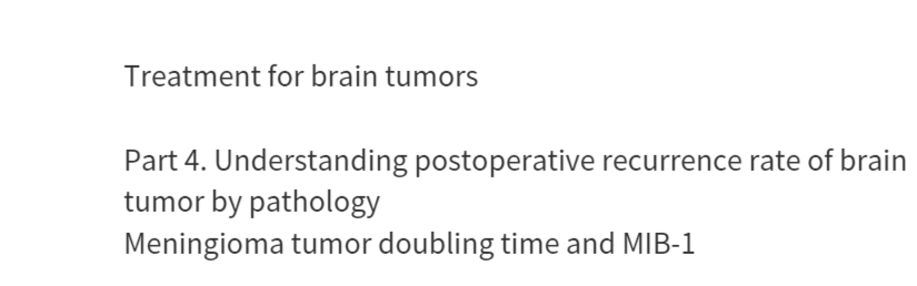 In collaboration with Dr. Takamitsu Fujimaki, current professor of neurosurgery at Saitama Medical University, and Dr. Akira Matsuno, current deputy director and supervising professor at International University of Health and Welfare, I performed craniotomy to remove the tumor and performed reoperation for postoperative recurrence. Using pathological specimens of 29 cases of meningioma that we performed, we examined the MIB-1 index, which is an index of tumor cell division (if formalin specimens are available, it can be examined many years after surgery), Published in Cancer, one of the most prestigious English-language journals in oncology, demonstrating an inverse relationship between time to double volume (tumor doubling time) and MIB-1. (Cancer1999;85:2249-54. Impact Factor 2015=9.329).MIB-1 & recurrent meningioma.pdf