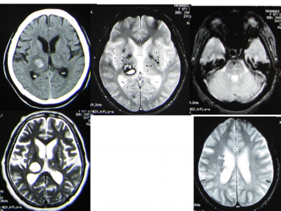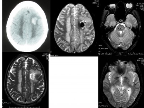 Head CT, MRI T2*-weighted image, T2-weighted image of left frontal subcortical hemorrhage.