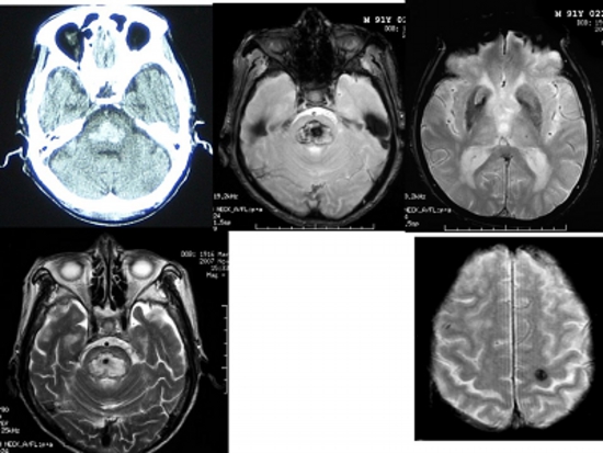 Head CT, MRI T2*-weighted image, T2-weighted image of acute pontine hemorrhage.