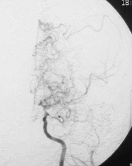 もやもや病の脳血管撮影の写真はこのように動脈の先が細くなり、もやもやとした血管の集まりが見られるのが特徴です。