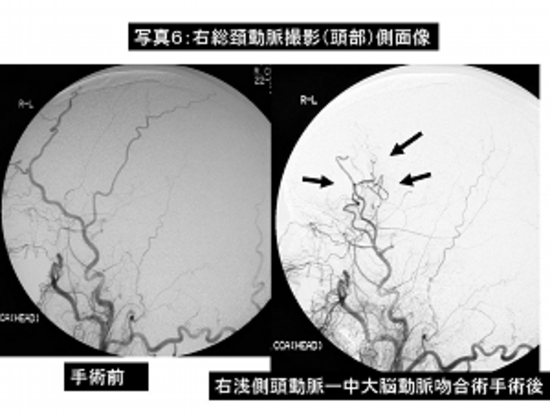 左は手術前の脳血管撮影、右は手術後の脳血管撮影で頭蓋外動脈(浅側頭動脈)から頭蓋内血管(中大脳動脈)への良好な血流が確認されます(→)。