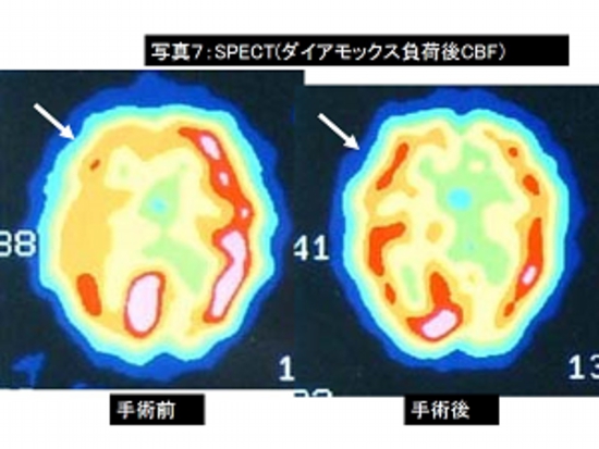 術後SPECTで右前頭葉の血流が著明に上昇しているのがわかります(→)。