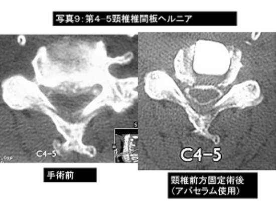 写真9:頚椎椎間板ヘルニアにて歩行障害、手指のしびれがあり、頚椎前方固定術(アパセラムを使用)を行いました。