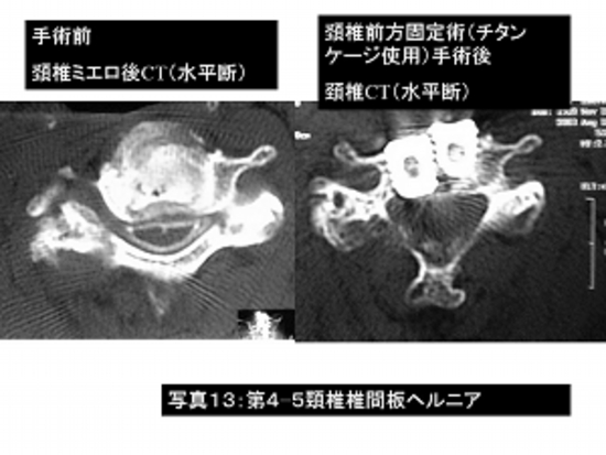 写真13:頚椎椎間板ヘルニアにて歩行障害、手指のしびれがあり、頚椎前方固定術(チタンケージを使用)を行いました手術前の脊髄造影検査で第4−5頚椎で脊髄が圧迫され変形がみられます。