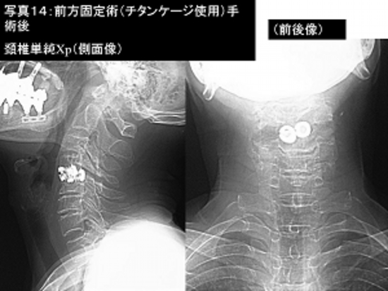 写真14:写真13の患者さんの手術後の頚椎単純レントゲン撮影像です。