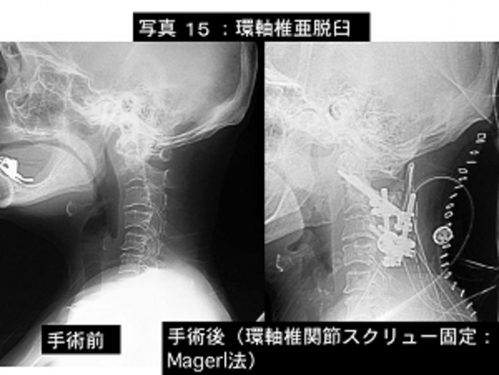 写真15:環軸椎亜脱臼といって、第1頚椎(環椎といいます)と第2頚椎(軸椎といいます)にずれが生じひどくなれば呼吸が止まることもある恐ろしい状態です。