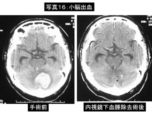写真16:小脳出血に対する内視鏡下血腫除去術。左は入院時のCT像、右は手術後のCT像です。血腫はほぼ全部除去されています。