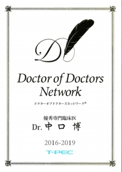★ドクターオブドクターズネットワーク 優秀専門臨床医2016-2019に中口が選ばれました。